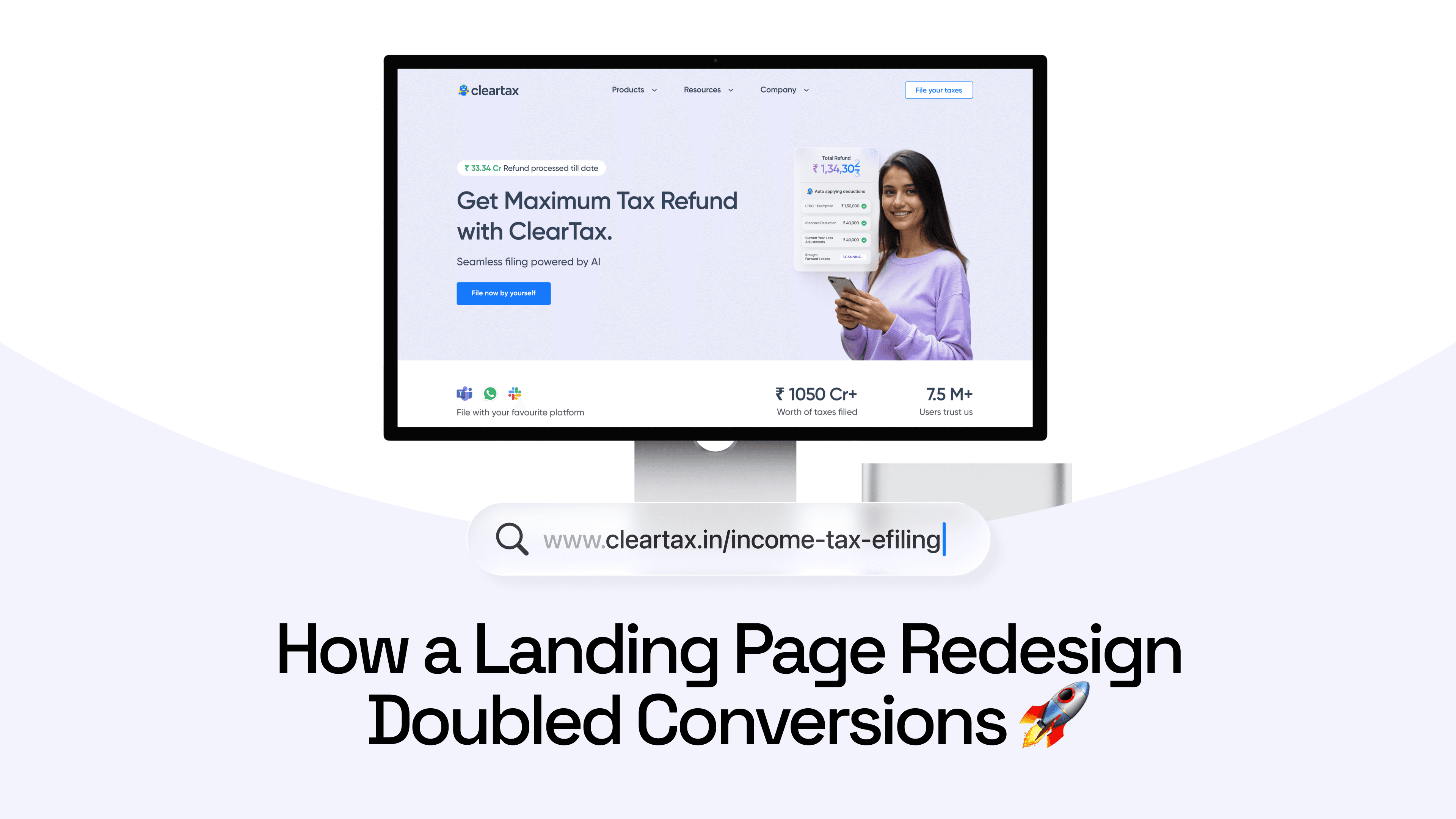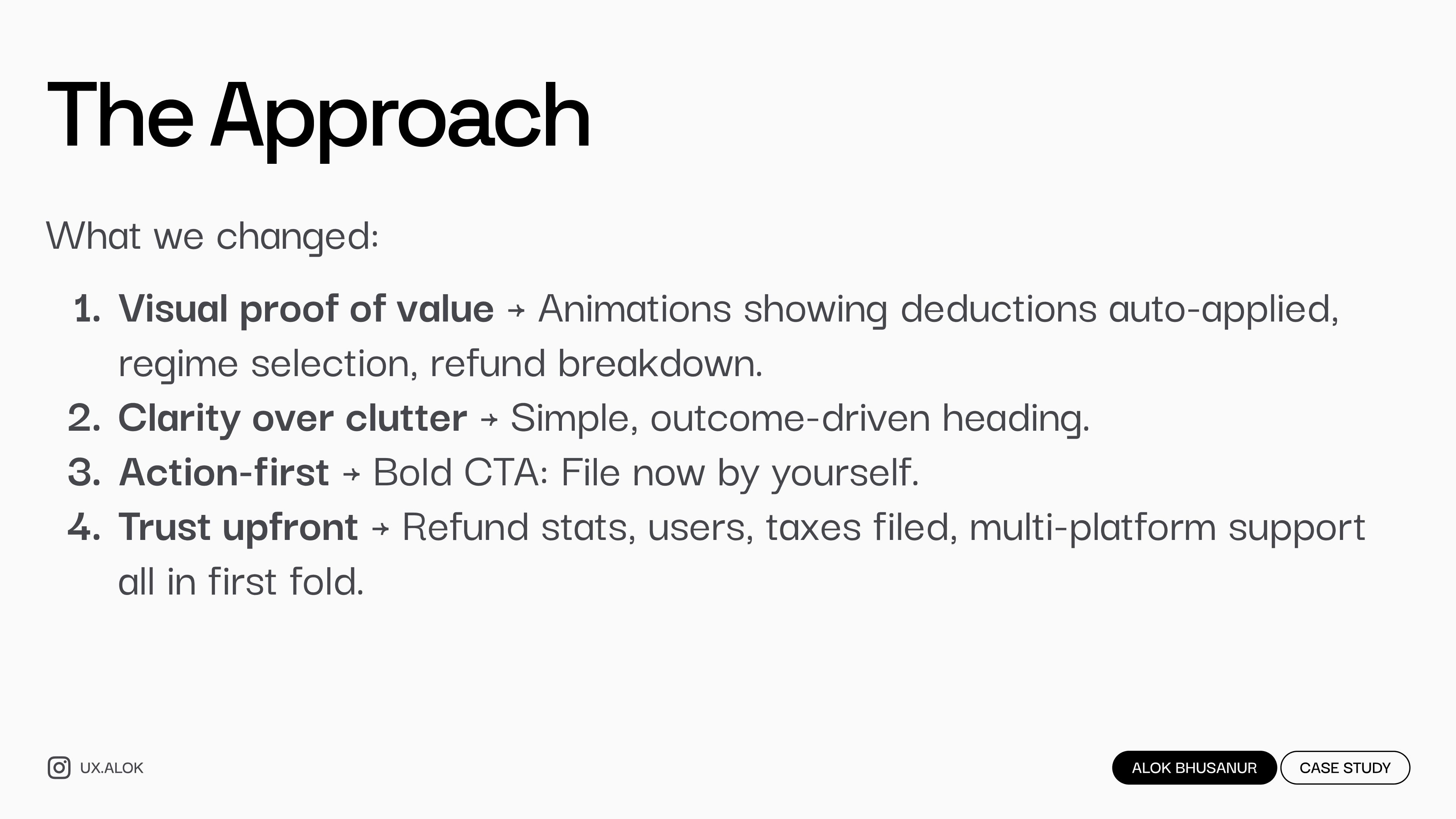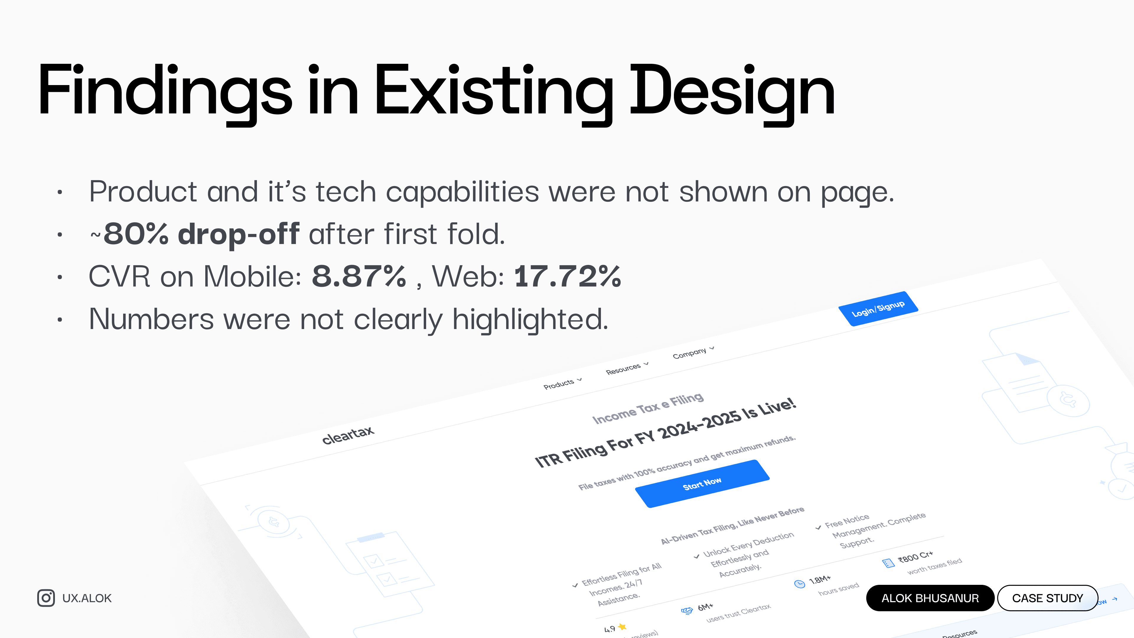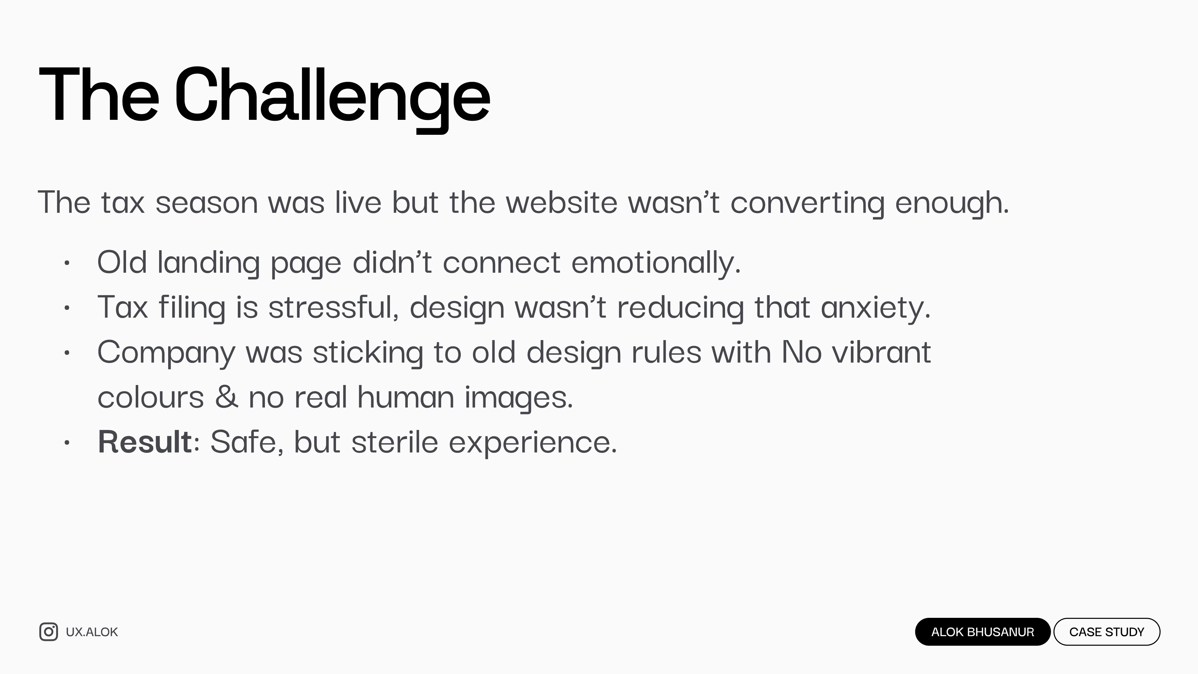 Our old ITR filing landing page was functional but not convincing. Users were dropping off heavily after the first fold. Here’s how I led a small design team to revamp the experience — making it more human, clear, and action-driven — which resulted in a 2X jump in conversions.