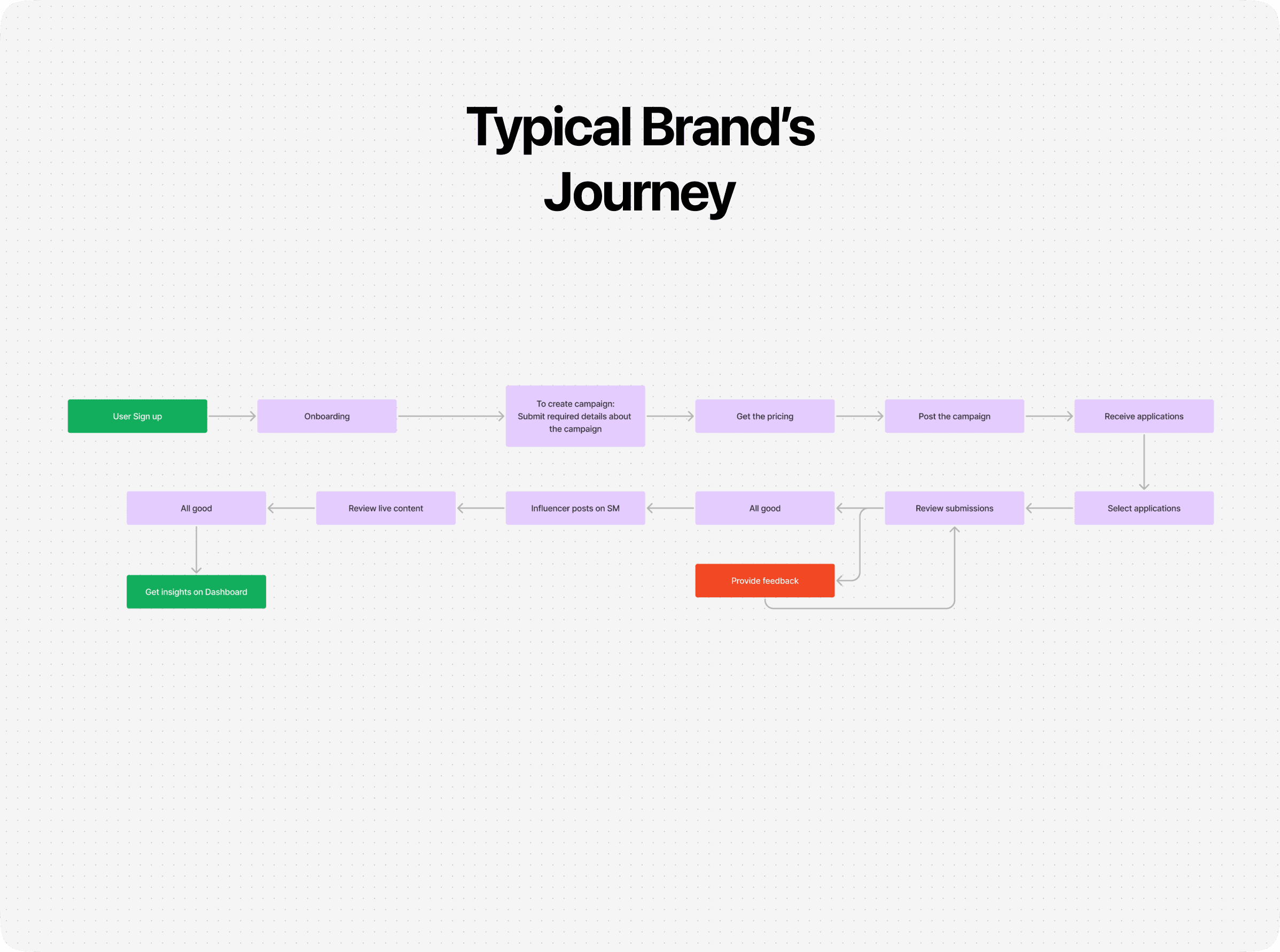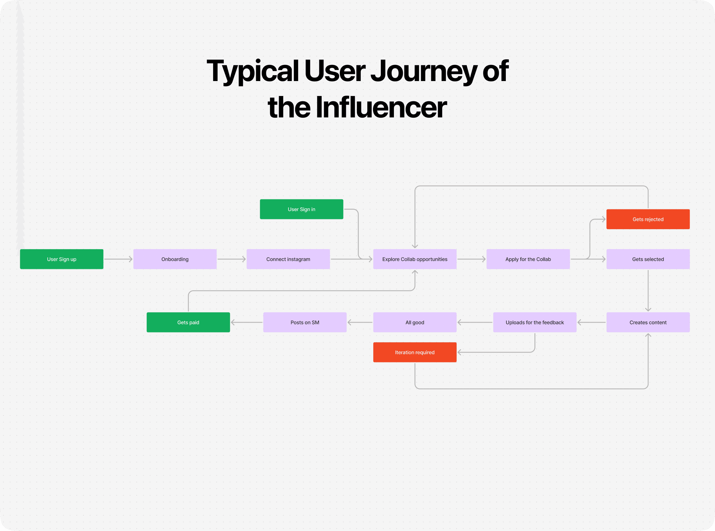 We began with mobile-first designs for influencers. The goal was to ensure influencers could easily log in, explore, and apply for opportunities posted by brands. Below is a snapshot of the user journey we crafted for influencers: