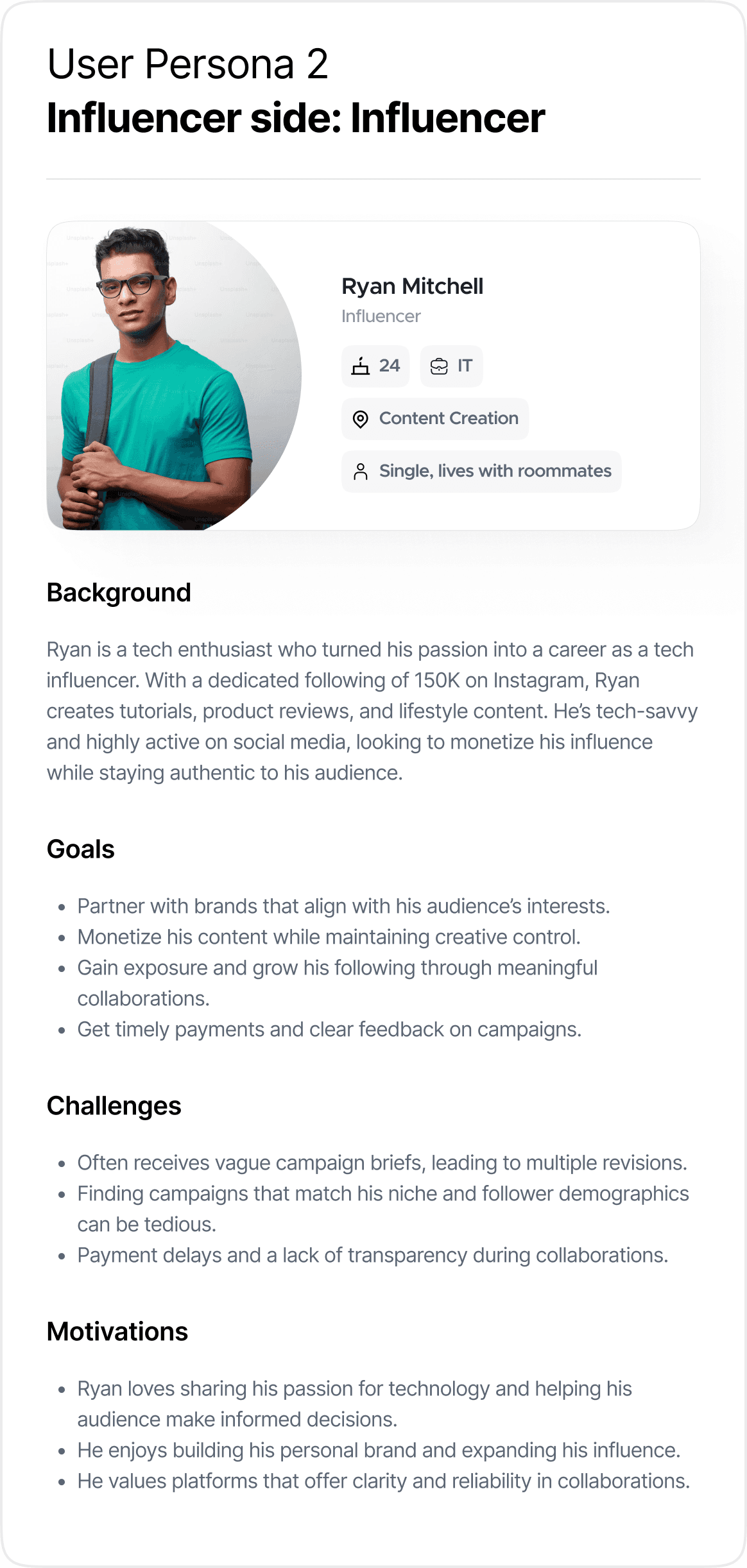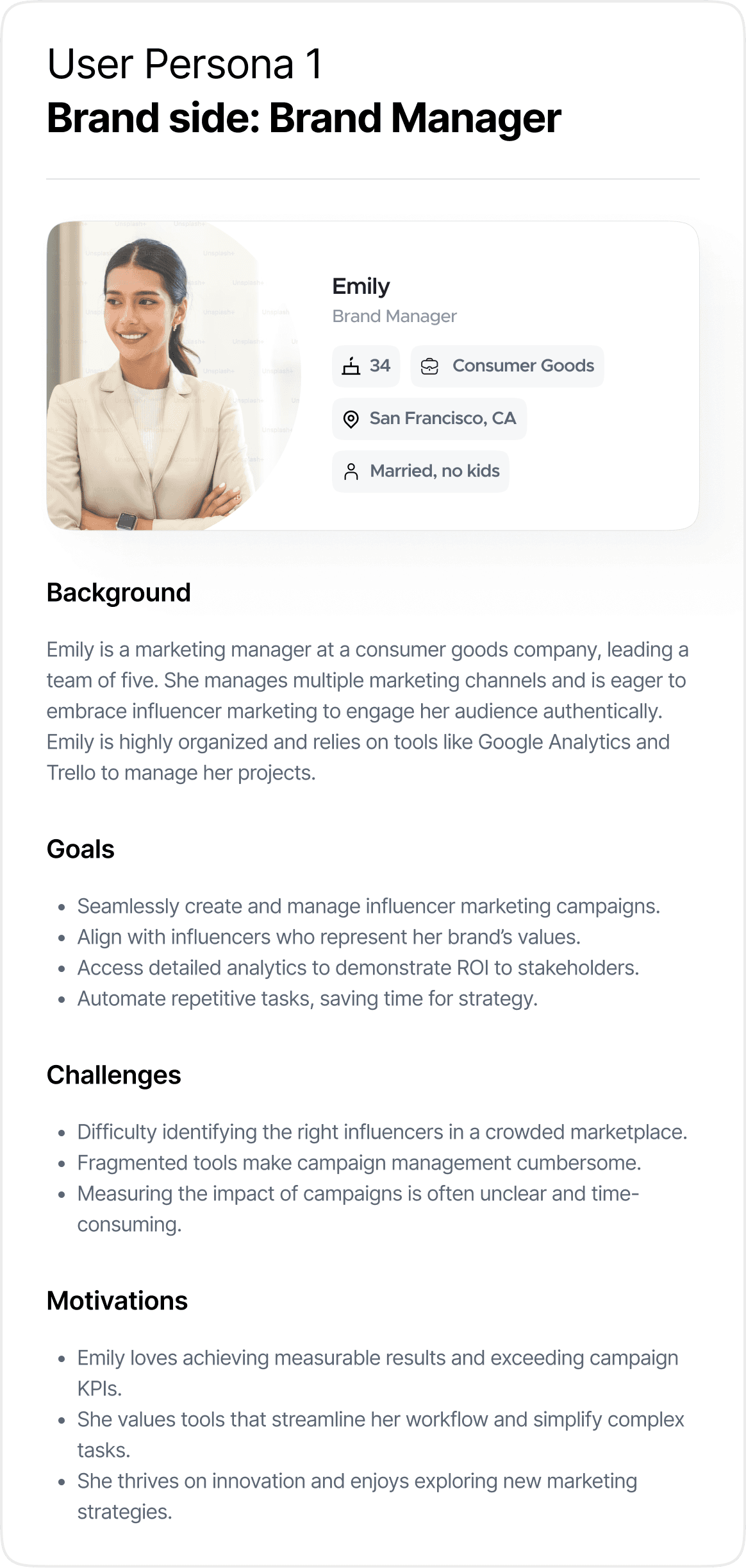 We came up with two personas for the brand side and the influencer side in order to better understand our users.