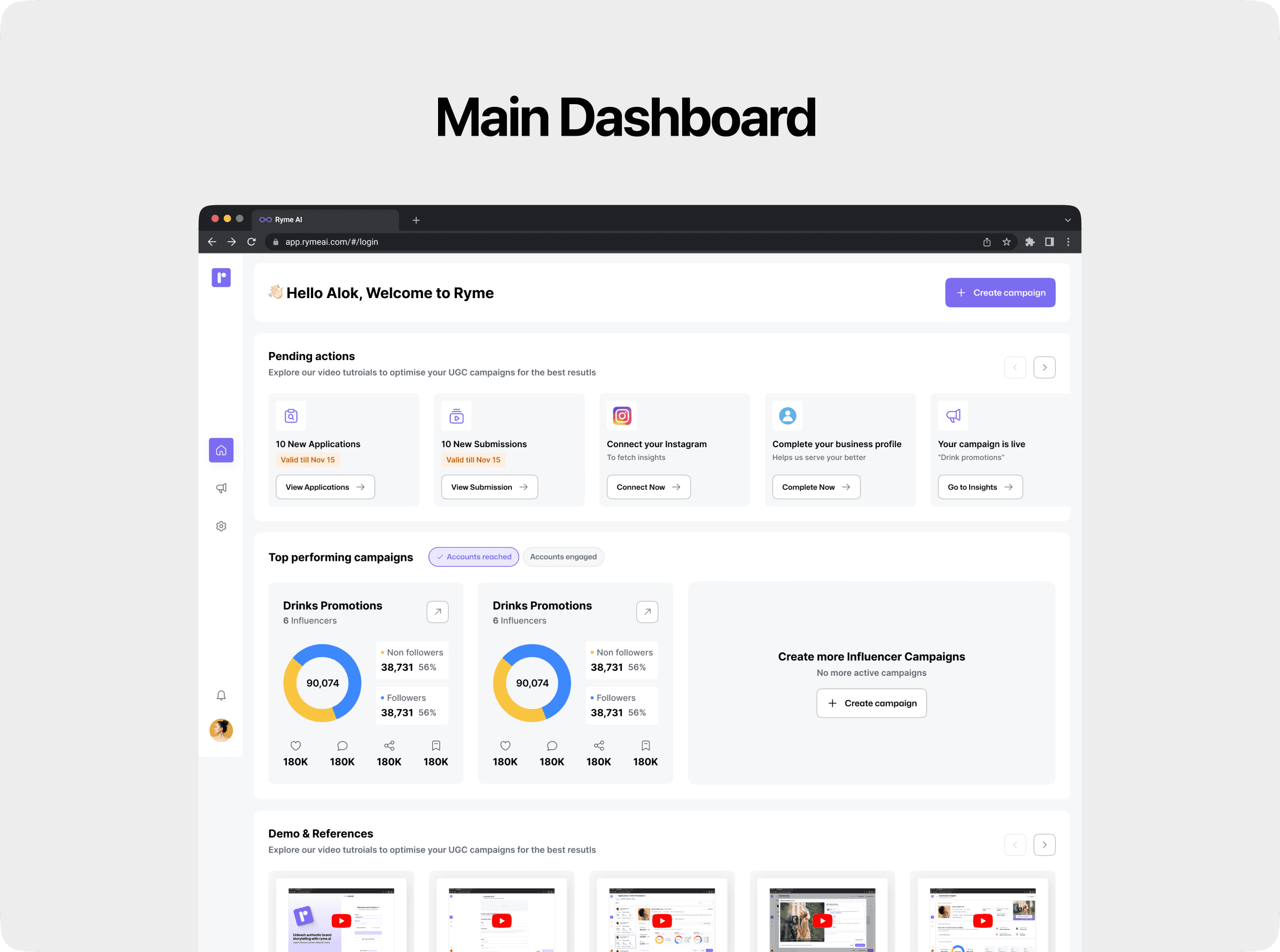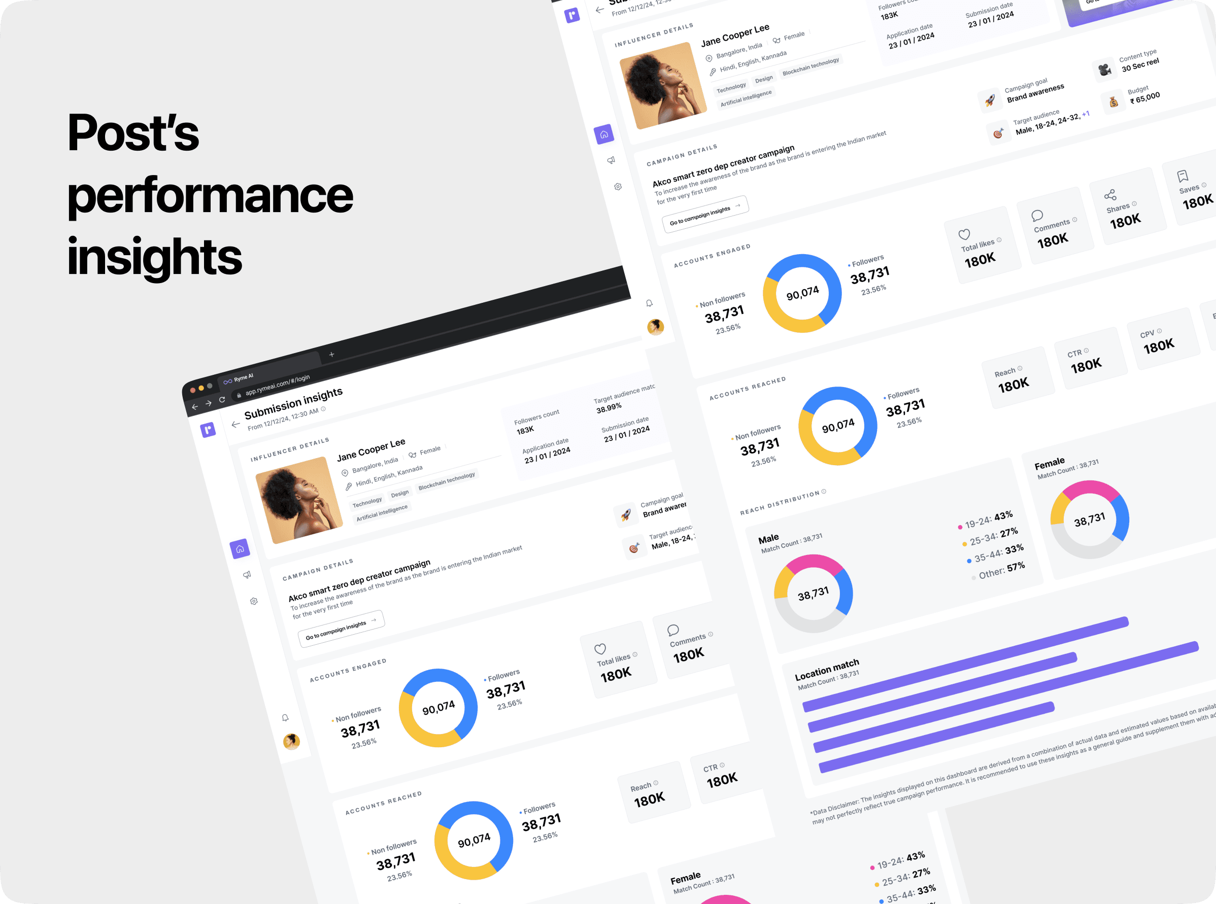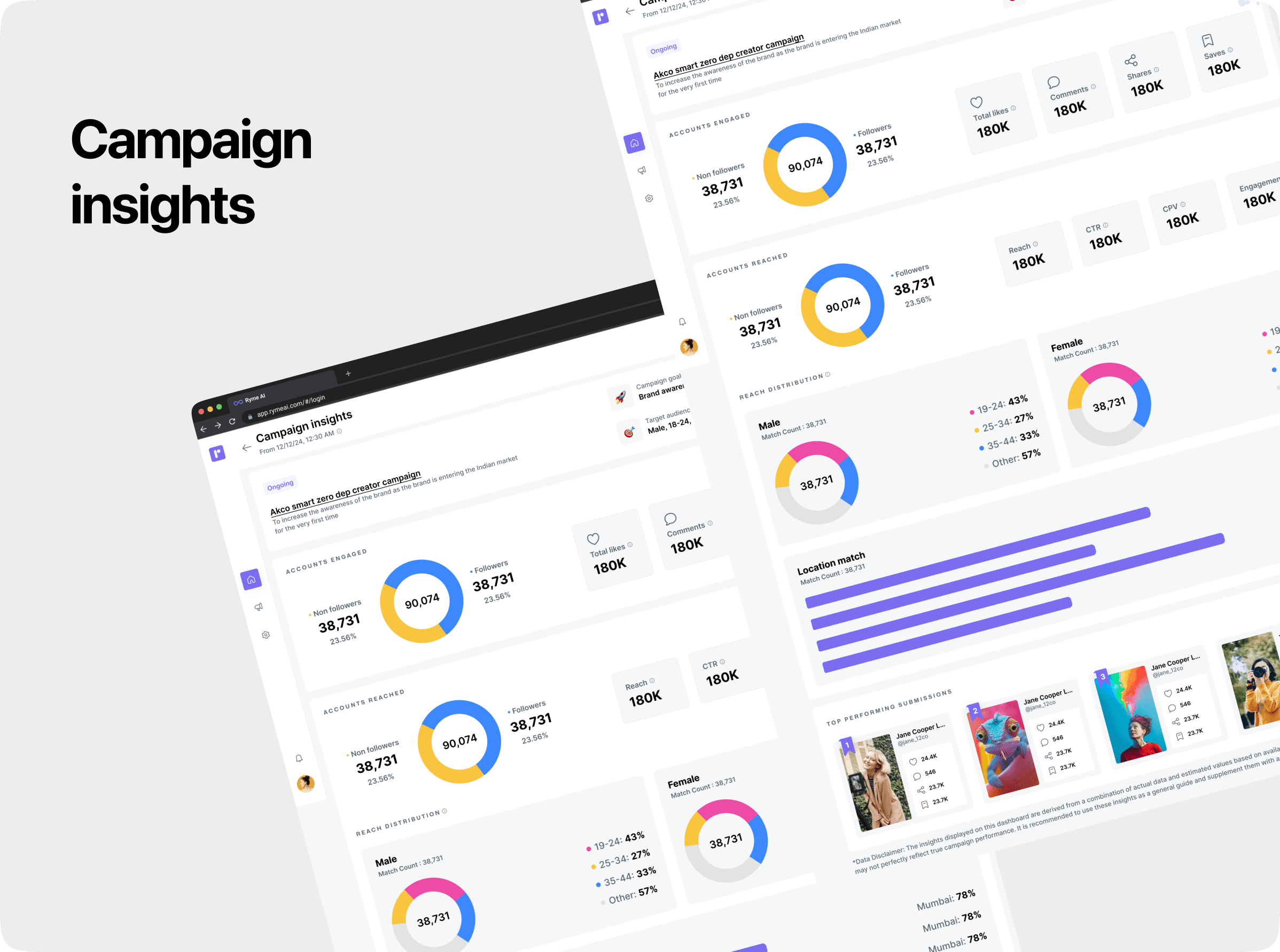 Clear Visual Hierarchy: Organizing information such as campaign performance metrics, submission insights, and influencer insights in an intuitive layout.